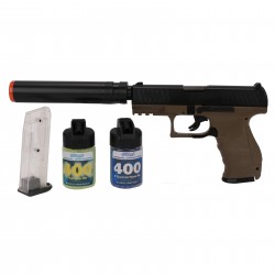 Walther PPQWalther PPQ Special Operations Airsoft Spring Pistol Combat Kit by Umarex - Tan/BlackFeatures:- Fully Licensed Walther Trademarks- Made from High Strength Polymer- Threaded Mock Silencer- Package comes with 2x Magazines, 400 Regular BBs, and 400 Nightglow BBsSpecifications:- Dimensions: 180mm x 130mm (350mm long w/ mock silencer)- Magazine...