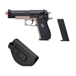 Recon Kit, 6mm Spring Powered Combat Pistol, Dark Earth/BlackSpring Powered Combat PistolFeatures:- Single shot- Fixed front and rear sights- Quick release 15 round magazineIncludes:- Pistol holsterSpecifications:- Color: Dark Earth/Black- .12G BB Velocity: Up to 280 fps- Caliber: 6.0 mm- Length: 9.00"- Barrel Material: Metal- Barrel Type: Smooth Bore-...