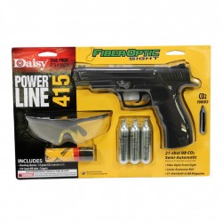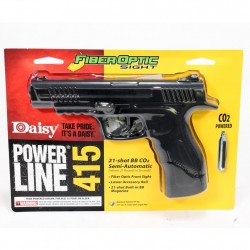 Powerline Air PistolDaisys PowerLine Model 415 Pistol Kit includes the 21-shot, semi-automatic, CO2-powered BB repeater, shooting glasses, three 12 gram CO2 cylinders and Daisys famous 350 count BB tube. Just load BBs into the built-in magazine, insert a CO2 cartridge into the grip and youre ready for semi-automatic pistol shooting fun. Great for learning...