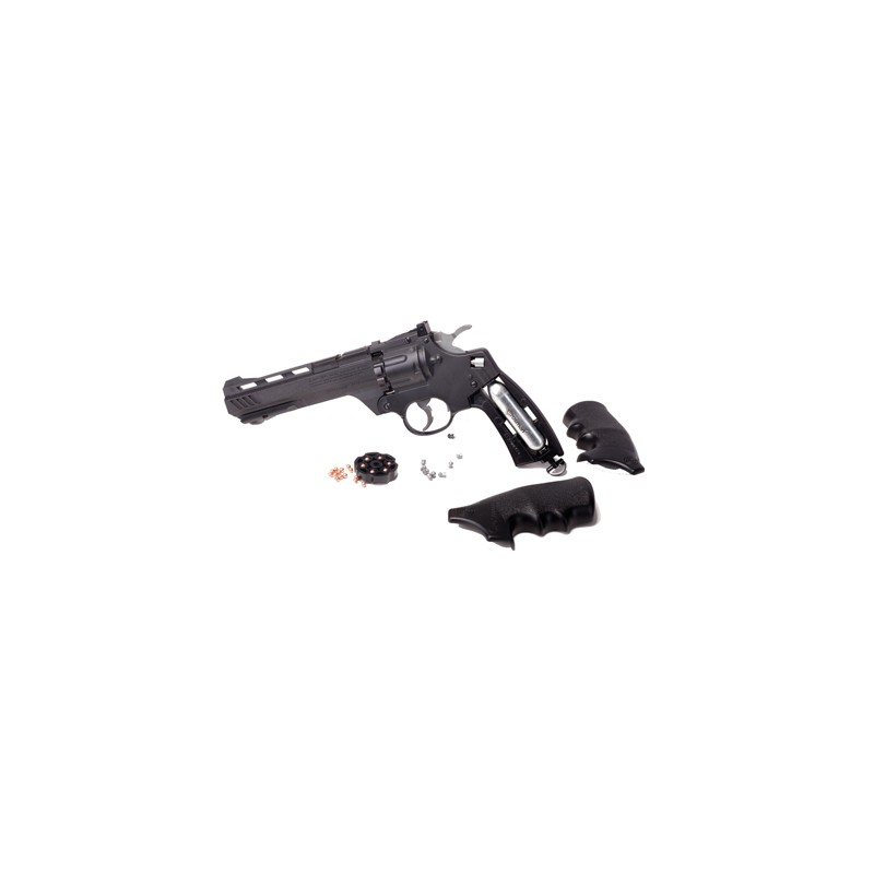 The Vigilante is a double action, semi-auto revolver that shoots pellets and BBs. Included is a 10-shot pellet clip and a 6-shot BB clip. It's powered by CO2 and shoots pellets up to 435 fps and BBs up to 465 fps through a 6-inch rifled steel barrel.