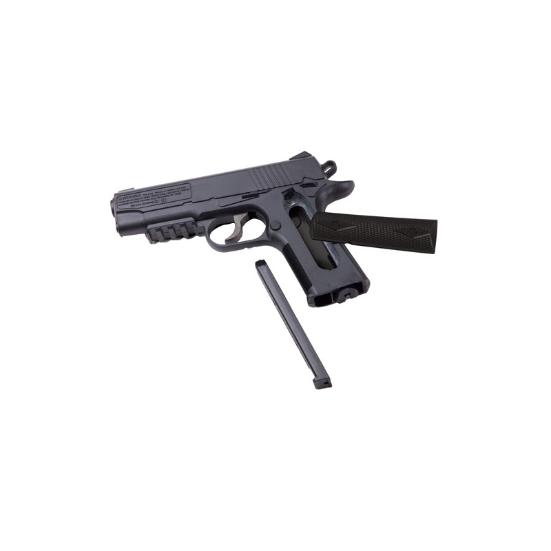 Take it outside with this 1911-styled CO2-powered semi-auto BB pistol! Checkered grips, polymer frame and a precision steel barrel delivers all the fun you can handle! The convenient drop-out magazine holds 20 BBs and the fixed blade front and rear notch sights keep you on target. A picatinny accessory underneath the barrel for adding your favorite accessories. Grip panels are easily removeable for replacing CO2 cartridges.