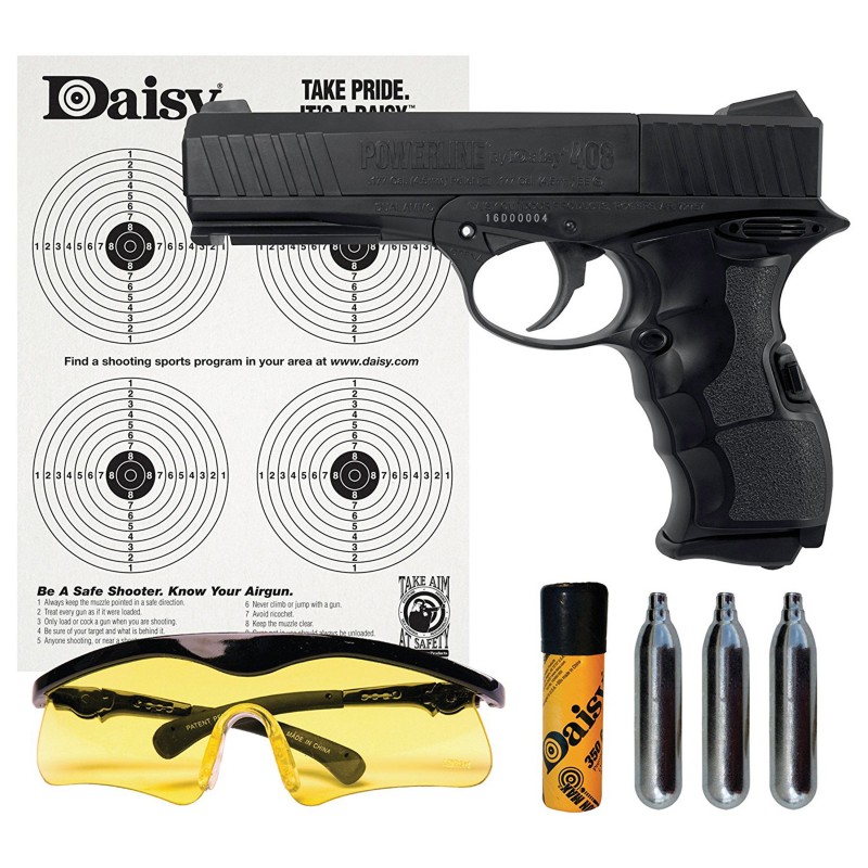 Daisy's PowerLine 408 is ideal for marksmanship training and hours of backyard shooting fun. Line up the front and rear white dot sights and squeeze the trigger to send ammo down the rifled steel barrel at up to 485 fps. The ergonomic grip features a pebble textured grip cover, enabling a steady grip similar to that of your firearm pistol. The magnetic 8-shot rotary clip of this semi-automatic CO2 pistol lets you load and shoot either BBs or .177 cal. pellets. Two clips are included so you can reload quickly and easily. This kit pairs the PowerLine 408 with everything you need to get started shooting: CO2 cylinders, a 350-count tube of Daisy BBs, a tin of pellets, shooting glasses, and targets.