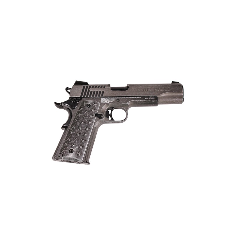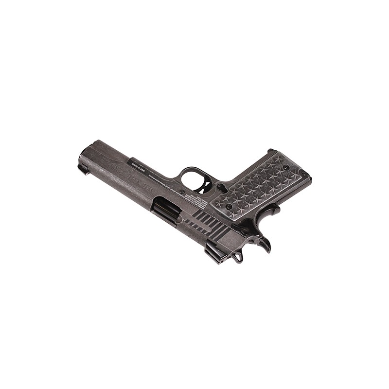 Modeled after the exceptionally popular 1911 We The People full-size centerfire pistol, which is inspired by a rich, patriotic history, the BB pistol version of this uniquely-American handgun features the same custom grips adorned with 50 stars (25 per side) that represent each state of the Union. A distressed finish on the stainless-steel slide and frame includes patriotic engravings, such as 13 stars atop the slide and We The People and 1776 on the slide flats.