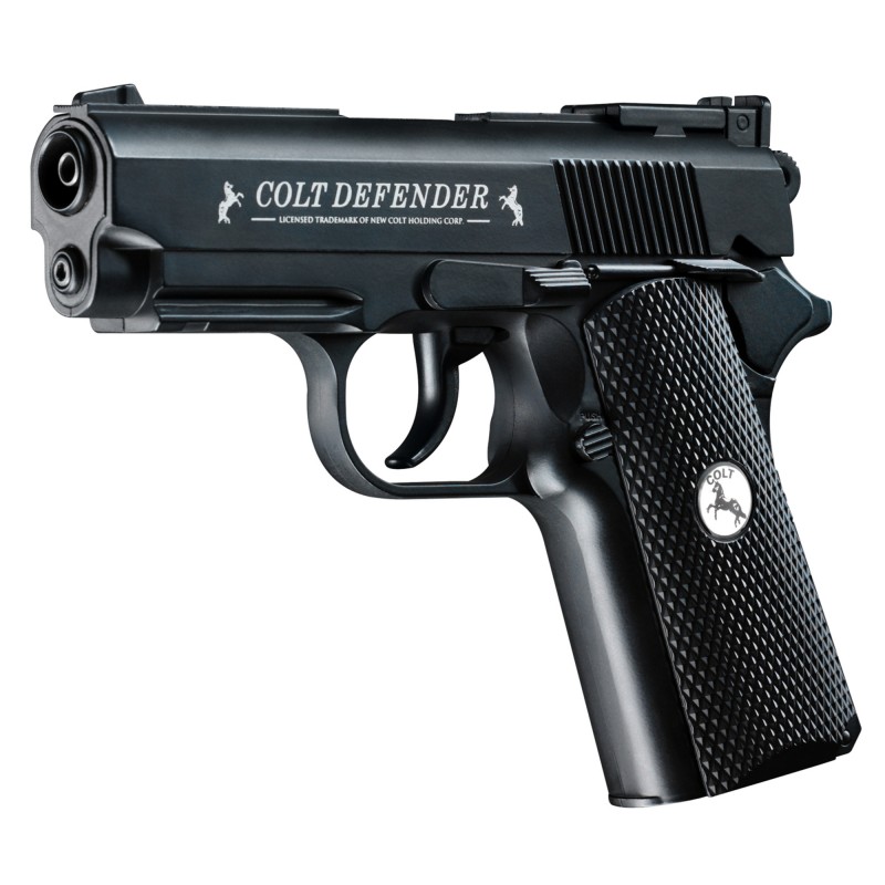 The Colt Defender BB Pistol has an all metal construction and a built in 16-shot BB magazine. The spring powered grip release and the CO2 compartment in the grip make this pistol extremely easy to operate. A fixed blade front sight makes aiming a breeze. Lightweight at 1.6 lbs.