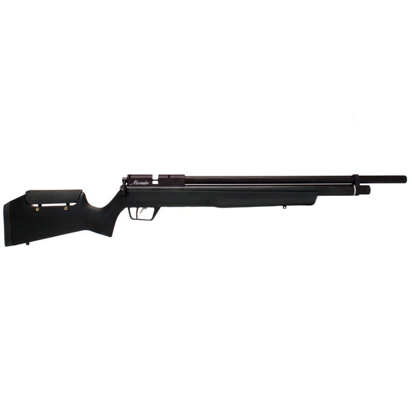 The Marauder goes lightweight with a all-weather, synthetic stock. Featuring an ambidextrous raised comb, its well-balanced for carrying in the field. This powerful PCP air rifle offers all the features needed for pest hunting small to medium sized game. The choked and internally shrouded barrel provides both precision and ultra-hushed operation, producing the most accurate and quietest rifle in its class. The two-stage, adjustable, match-grade trigger system helps to make every shot smooth and steady, while the innovative 10-round magazine allows for fast follow-up shots. With the built-in pressure gauge and quick-disconnect Foster fittings, this gun is quick and easy to fill so you can refill and return to shooting sooner.