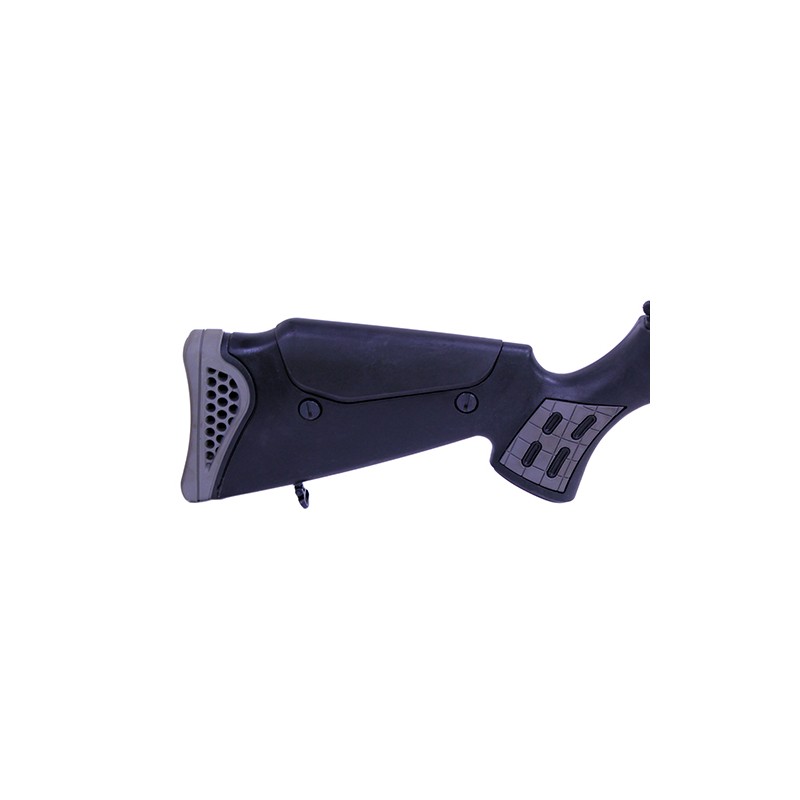 - Ambidextrous designed synthetic stock with adjustable cheek piece and raised forearm grip.