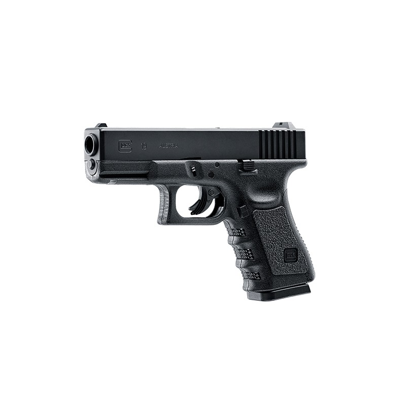 The GLOCK 19 is ideal for a more versatile role because of its reduced dimensions when compared to the standard sized option. The CO2 airgun replica of the GLOCK 19 in .177 caliber is compact and handy, with the unmistakable look of the original pistol and plenty of power. In spite of its relatively small length of 7.25", it fires .177 caliber steel BBs with a muzzle velocity of up to 410 FPS and weighs a satisfying 25.6 oz. In true Umarex replica form, it has a metal slide and a trigger blade safety.