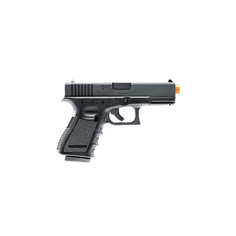 The GLOCK 19 is a compact version of the GLOCK 17. Both the grip and slide of the G19 are shorter, making for a quick handling, easy carrying sidearm that is a hit with handgun shooters everywhere in the US. This Umarex airsoft replica G19 features the same ergonomics, function, and handling as its firearm counterpart and even comes in very close to the same weight. The G19 gas blowback action pistol likes to show what it is made of. Take it apart, clean, reassemble, and holster with the same ease that the firearm offers. Airsoft enthusiasts can expect to launch from the drop free magazine 19 rounds .20 gram BBs at 290 FPS.