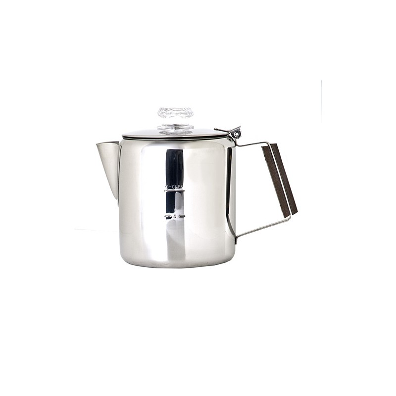 The Timberline Coffee Percolator with its heavy gauge 18/8 polished stainless steel construction and heat insulating Permawood handle makes perfect coffee at picnics, camp and home.