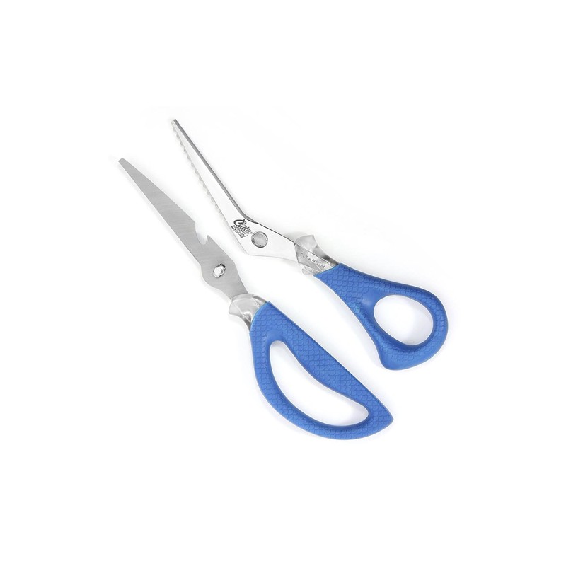 This 8" Marine Shear features detachable handles for easy cleaning. Blades are Titanium Bonded High-Carbon Steel which is 3x harder than untreated steel and will stay sharper longer. One blade edge can be used as a fish scaler and another blade has an integrated bottle opener. Cutting edges are serrated for increased performance. Full tang construction and non-slip Cuda scale pattern handles.
