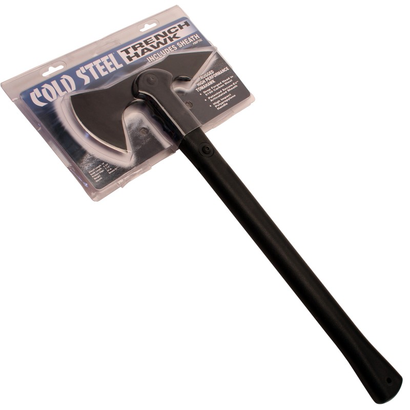 The Trench Hawk by Cold Steel is a tactical tomahawk that features a drop forged from 5150 carbon steel and differentially hardened, the head will withstand tremendous blows and the awful stress of continued throwing. The Trench Hawk's cutting edge and spike also provide a big tactical advantage, as either can be used for hooking or trapping and its length can be used to parry or block an incoming blow. The polypropylene handle of the Trench Hawk is also highly resistant to shock and impact and will withstand abuse that would easily break even a tough hickory handle. Finally, to help protect its owner from its cutting edge and dangerously sharp spike, it comes with a Secure- Ex sheath.