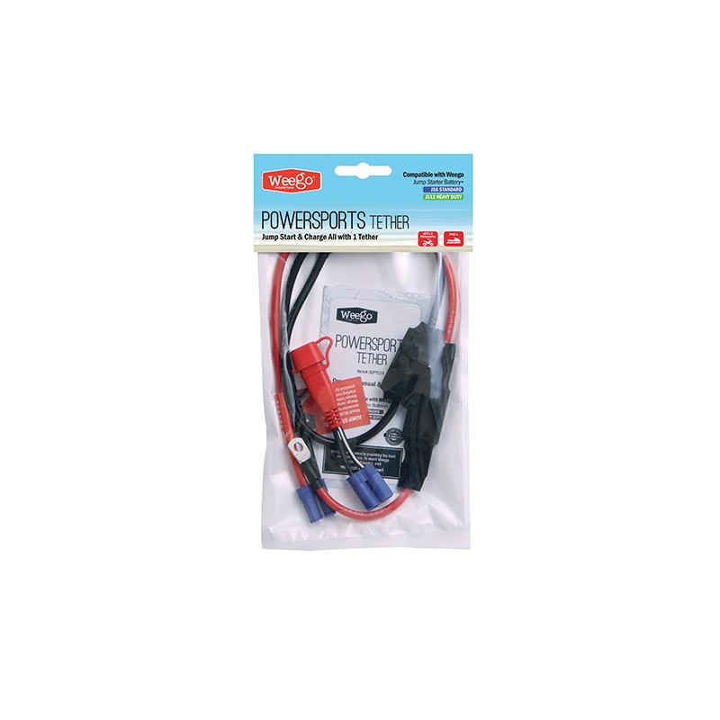 Weego Powersports Tether allows you to jump and charge with one tether! It is the ultimate convenience tool for anyone that needs access to a hard-to-reach battery. Never dig under your seat again. An SAE adapter for trickle charging included it attaches right onto your tether for a no-hassle alternative. Perfect for motorcycles, ATVs, UTVs, personal water craft & more.