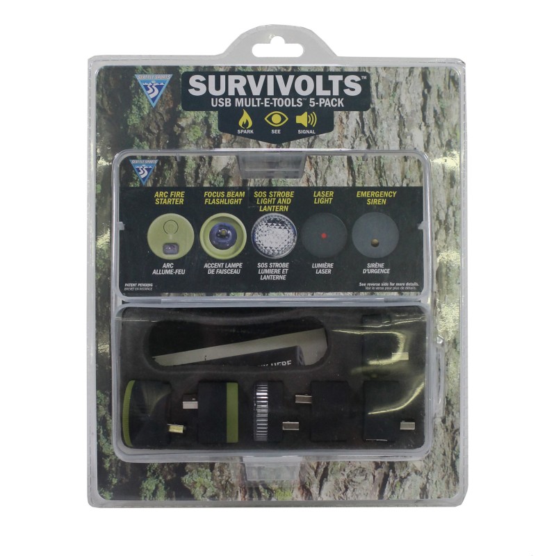 Turn your ordinary powerbank into an extraordinary multi-tool! The Survivolts Backcountry Mult-E-Tools kit includes six USB fobs designed for use on the SurviVolts Powerbank. The fobs can also be popped on to any powerbank with a USB port to create a flashlight, a strobe light, a firestarter, siren, or laser. The sixth fob is an on/off switch.