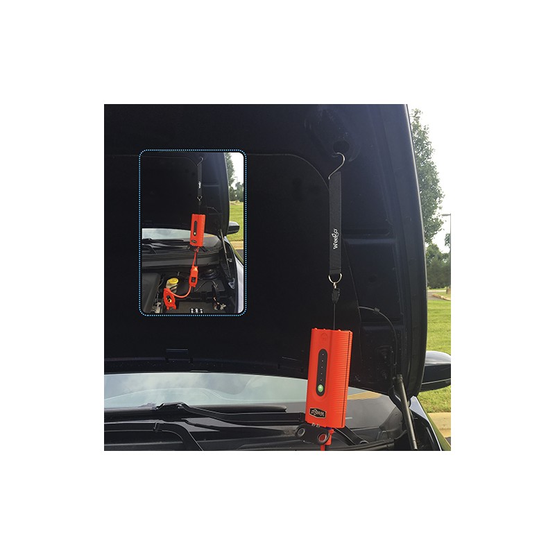 - Hook and lanyard suspends Weego from a vehicles hood to light the engine below or to use as a camp or work light