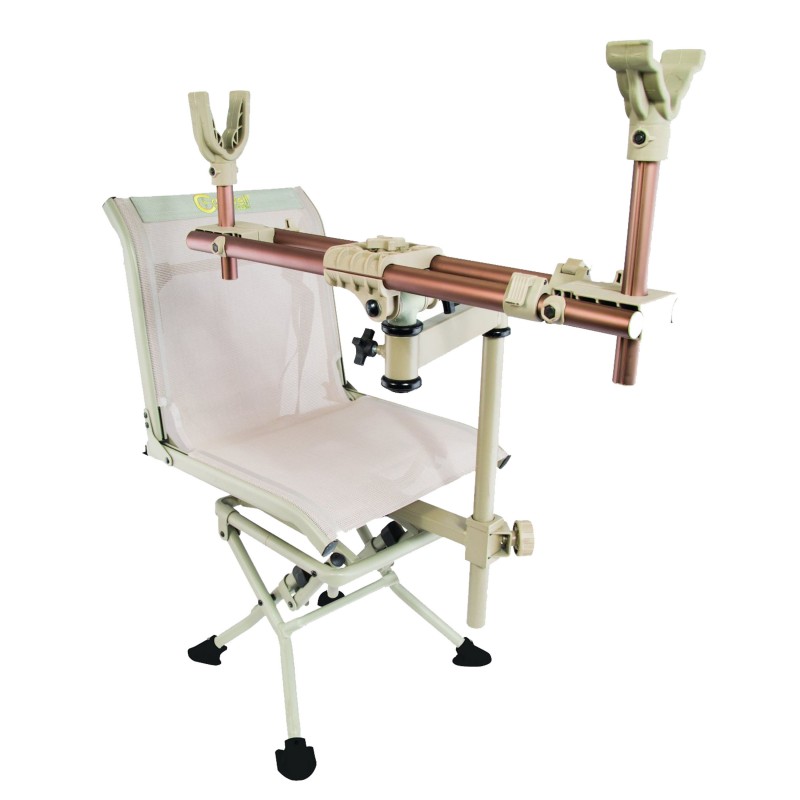 The DeadShot ChairPod by Caldwell is based on the popular FieldPod design and provides shooters portable benchrest accuracy. The ChairPod eliminates the need to take a chair and shooting rest separately with you to the field or range and combines the two with a heavy duty chair with swing arm assembly to support your weapon. This stable support system will distribute the weight of the weapon evenly and leave your hands free to use binoculars, calls, or keep them warm in your pockets. The multi-bearing swing arm system provides smooth movement to extreme angles left and right with the chair having the ability to swivel 360 degrees allowing shooters a full range of shot possibilities. Rubber overmolded front and rear forks on the upper rest portion will adjust in length to accommodate any firearm or crossbow. The backpack style straps attached to the seat allow you to easily carry this system to the ground blind. If you are a hunter who prefers to hunt from the ground or you just need a stable way to sight in your weapon, the DeadShot FieldPod will allow you to achieve accuracy you never knew possible.