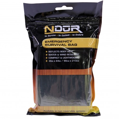 The NDuR Emergency Survival Bag comes in a small compact packable size but yet opens into a full sized sleeping bag that will fit a fully clothed adult. It is made of a strong insulating material which reflects back 90% of the user's body heat. It not only helps to provide protection in various weather conditions but also prevents and assists treatment of Hypothermia.