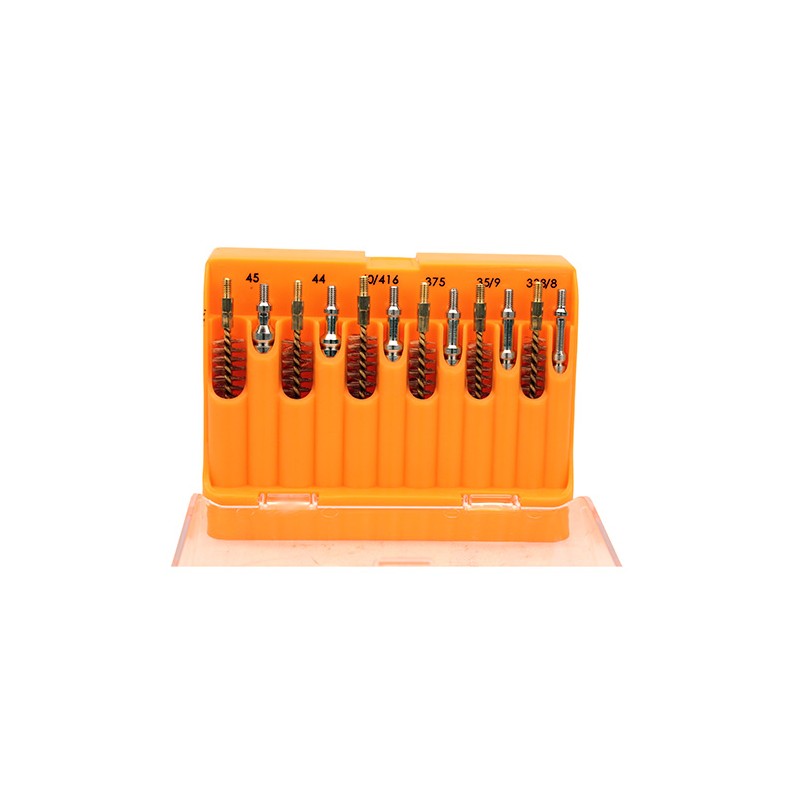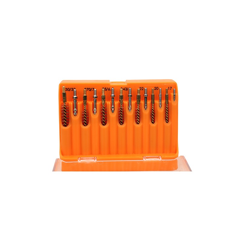 Created to keep your bore cleaning necessities protected and organized in a durable, hinged storage container. Containing 26 pieces organized by caliber, this Gun Cleaning Kit from Lyman has slots for each jag and brush from .17 to .45 calibers.