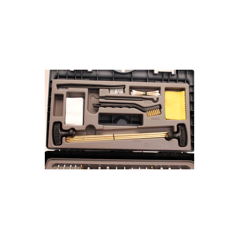 The professional grade kit contains gun cleaning components that discriminating gun shooters will appreciate in a tool box that was specially designed for Gun Cleaning tools and accessories. The 15" x 10" x 8.75" box has dual latches, a lockable lid with 7" x 3" x.6" compartments with see-through lids. Inside, the cleaning components are held in two, nested trays with custom-fitted compartments for each accessory. Each compartment has the name of the component it holds, molded into or tray. Solvents and cleaning chemicals (not included), can be kept with the patches, etc. in the bottom of the tool box.
