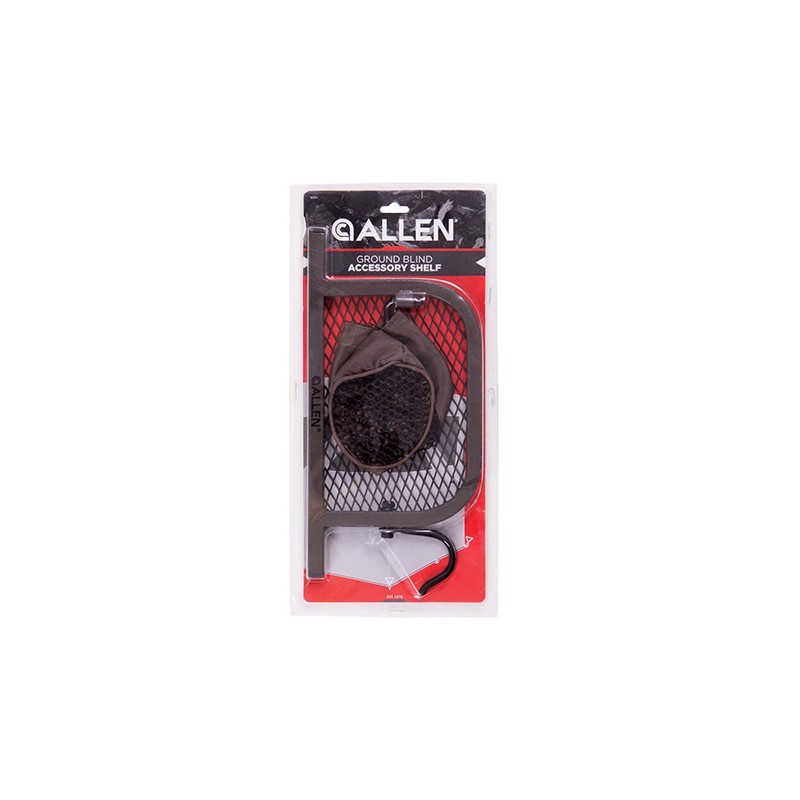 Allens Ground Blind Accessory Shelf installs quickly on most hub-style ground blinds and lets you organize game calls and smaller accessories. Includes a drink holder, a shelf, and two hooks for hanging items.