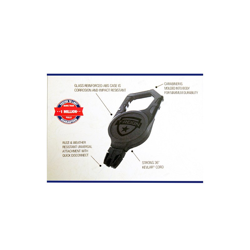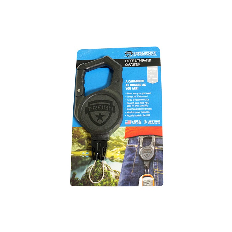 The T-Reign Integrated Carabiner Tether has a durable glass reinforced ABS carabiner housing and a Tough Kevlar cord and available in three retraction forces ranging from 8 oz to 20 oz. The Universal end fitting securely holds and protects electronics, tools and gear and additional end fitting options are available separately. The T-Reign Integrated Carabiner Tether is proudly made in the USA.