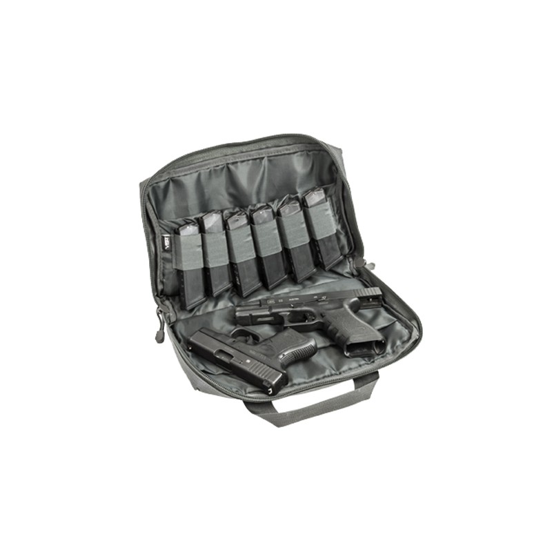 This NcStar 2903 Discreet Handgun / Pistol Cases are equipped with two separate padded compartments that will accommodate one full size handgun each. Also, there are six elastic loops that will accommodate up to 6 double stack ammo magazines or 12 single stack magazines. Reinforced wrap-around carrying handles and a heavy duty double zipper makes this Ncstar Discreet Pistol Cases durable yet convenient to carry to the range, or any where a small case is needed.