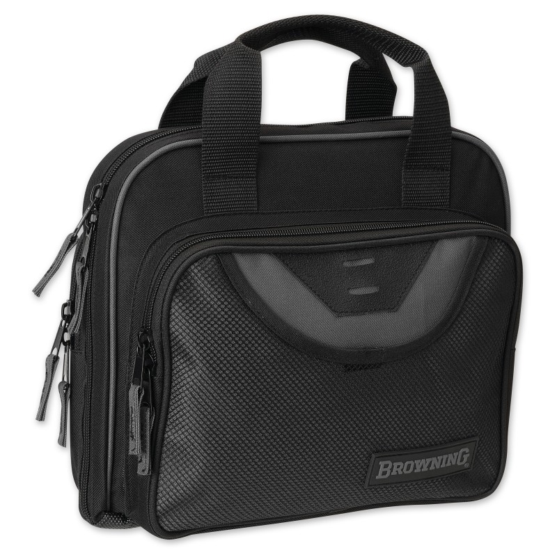 One simple zipper closure and two offset pockets in a single carry case. Carry your pistols to the range or out to your favorite shooting spot, snug and unscratched. There aren't a excess of buckles, "tactical" webbing, or any of that other stuff that you really don't need, just a few external pockets for spare magazines and ammo.