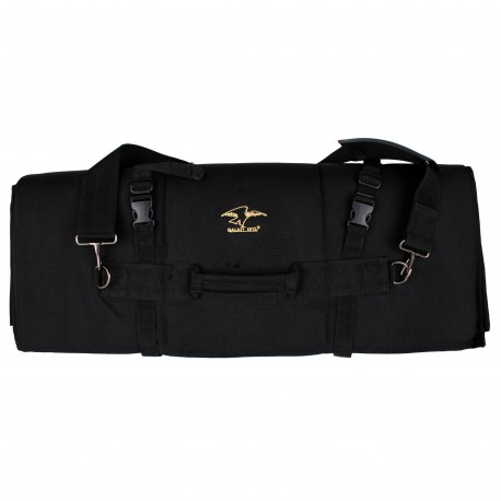 Ideal for any type of firearm, the Roll-Up Shooters Mat is created from Cordura Nylon and provides durable resistance on any ground cover. The water resistant material protects the Mat from absorbing any moisture. The Mat consists of three panels with 1/2" of padding. An additional flap folds out on each side to provide extra space. When in use, the Mat measures 67" in length and 51" in width.