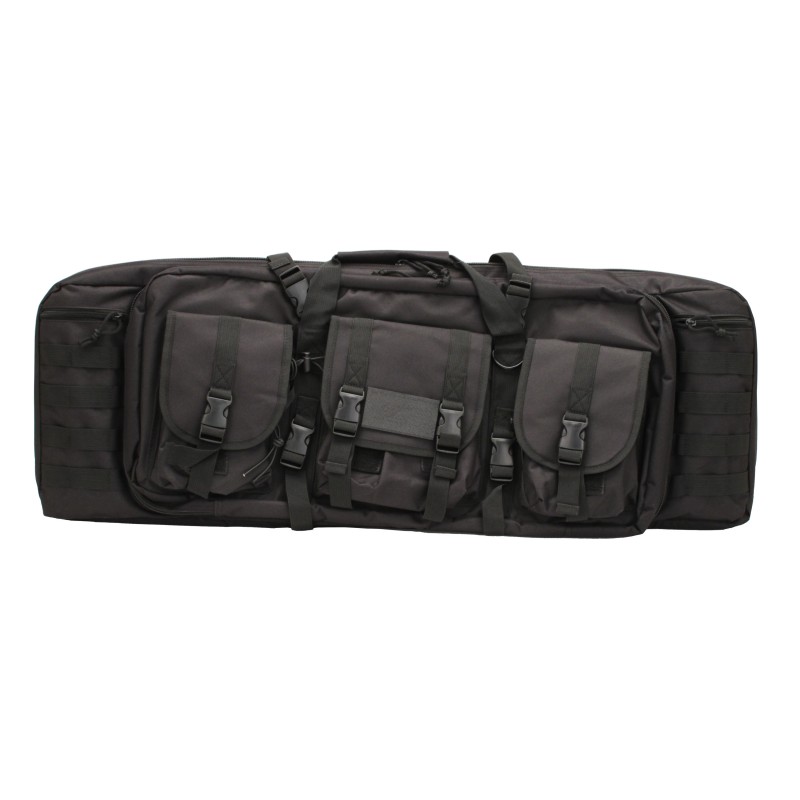 The NcSTAR Vism 36" Double Carbine Case (Black) is constructed of heavy duty PVC material and protects up to 2 carbine sized rifles. The primary compartment will accommodate 2 rifles 35 inches in overall length with a thick padded center divider and 4 hook and loop straps to properly secure each rifle. The secondary compartment is loaded with pockets to store extras such as handguns, optics, cleaning supplies, log books, etc. The three exterior pockets are perfect for keeping your magazines and ammo organized.