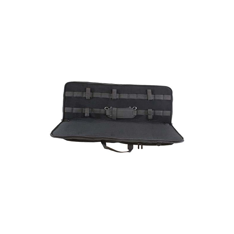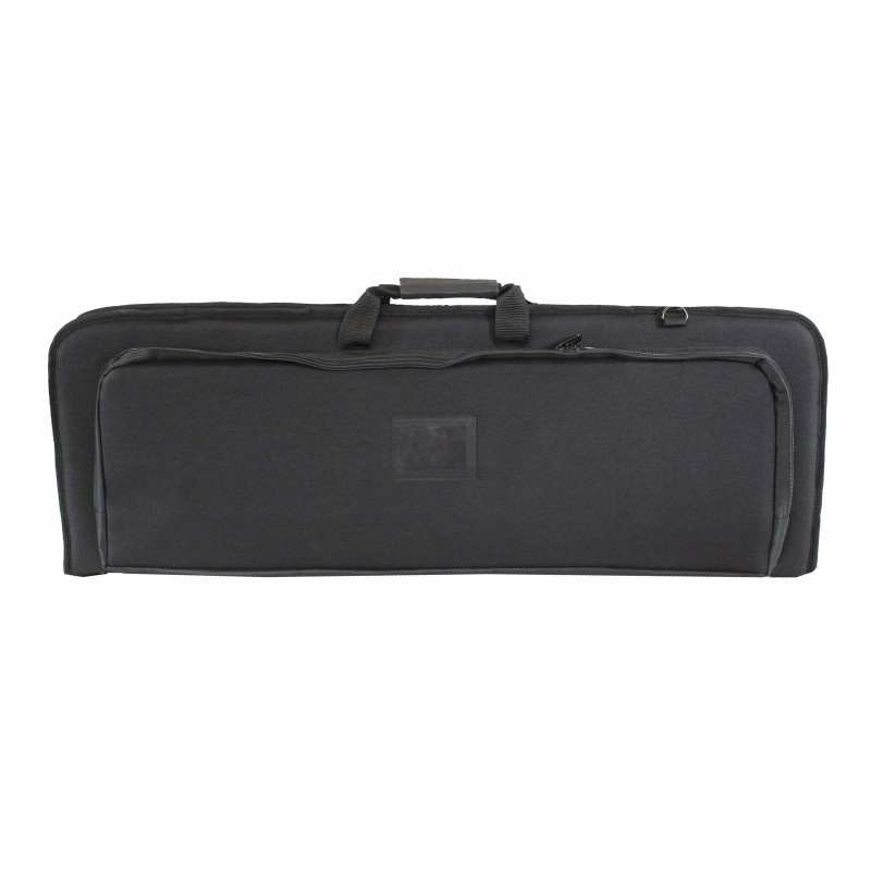 Main zippered compartment with metal lockable zipper pulls features two rows of ladder webbing for the hook and loop straps to secure various types of long gun(s) in the Deluxe Rifle Case. Six hook and loop straps are included to secure the long gun(s) in the main compartment. Deluxe Rifle case also features: two carry handle straps, an adjustable 2" shoulder strap with shoulder pad, and an I.D. pocket.