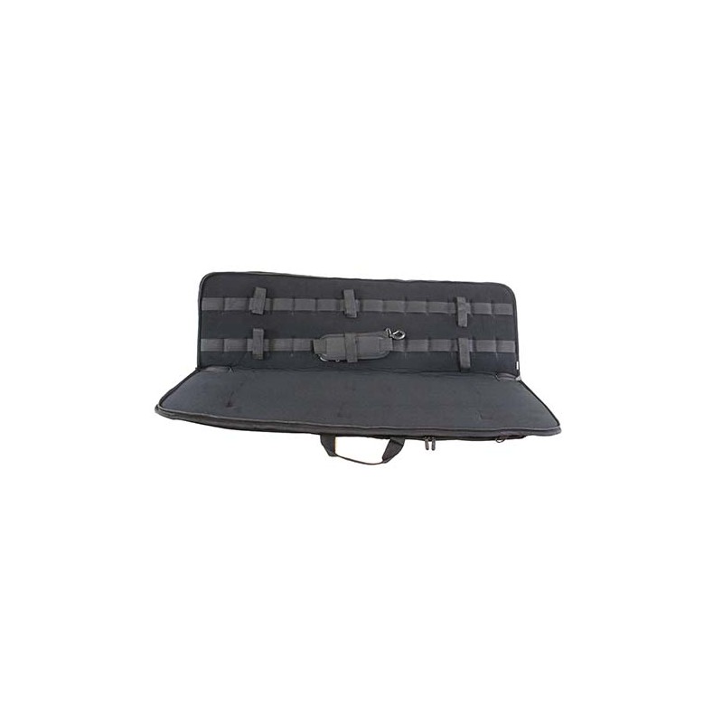 Main zippered compartment with metal lockable zipper pulls features two rows of ladder webbing for the hook and loop straps to secure various types of long gun(s) in the Deluxe Rifle Case. Six hook and loop straps are included to secure the long gun(s) in the main compartment. Deluxe Rifle case also features: two carry handle straps, an adjustable 2" shoulder strap with shoulder pad, and an I.D. pocket.