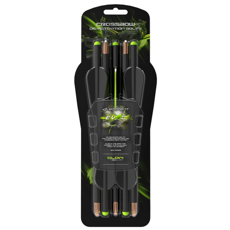 Barnett's Evac Decocking Bolt allows you to unload your crossbow quickly and safely without damaging one of your hunting bolts. By simply placing the bolt in the flight track, aiming your bow at the ground at a 45° angle and shooting, you'll release all kinetic energy stored in your crossbow. And, at 500 gr., it's suitable for use with even the most powerful equipment. Glow Tech fletching makes the cock vane easy to distinguish. 100% biodegradable construction.