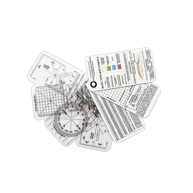 Navigation cards designed by Randalls Adventure & Training for use with a map and compass. Three instruction cards and four clear cards used to overlay the map to determine grid locations, azimuths and distance.