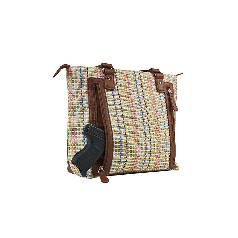 Woven Tote featuring a zippered pocket in the front and the primary CCW compartment is located on the back side of the purse with two zippers on either side for easy access to the holster.