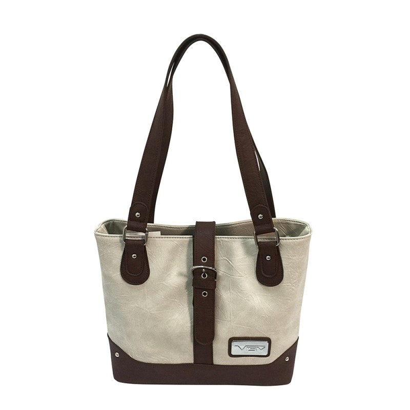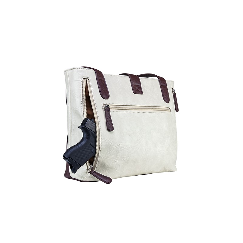 Faux leather Tote Bag with two CCW compartments located on the back side of the purse with three zippers, two zippers on the either sides of the purse to access the primary compartment and a center secondary pocket with a top zipper.
