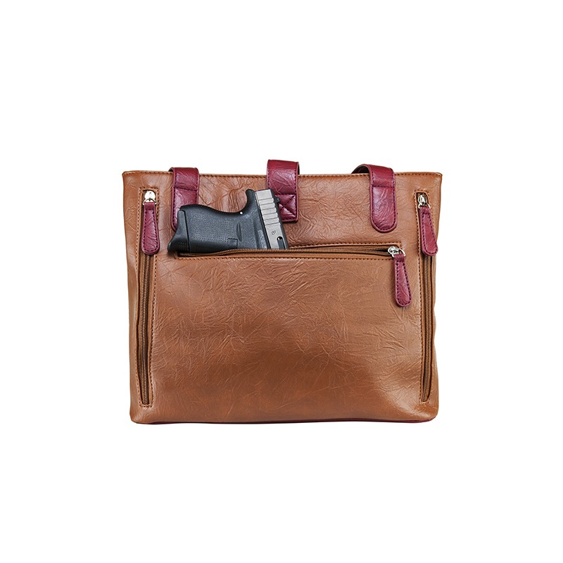 Faux leather Tote Bag with two CCW compartments located on the back side of the purse with three zippers, two zippers on the either sides of the purse to access the primary compartment and a center secondary pocket with a top zipper.