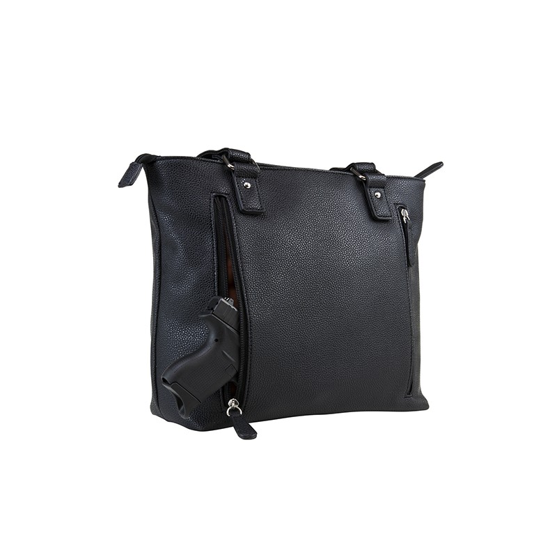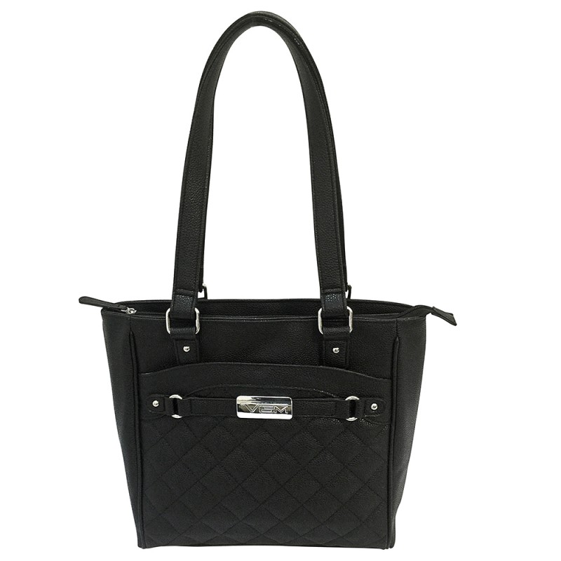 Faux leather Tote purse featuring a large quilted front pocket with magnetic snap-button closure and the primary CCW compartment is located on the back side of the purse with two zippers on either side for easy access to the holster