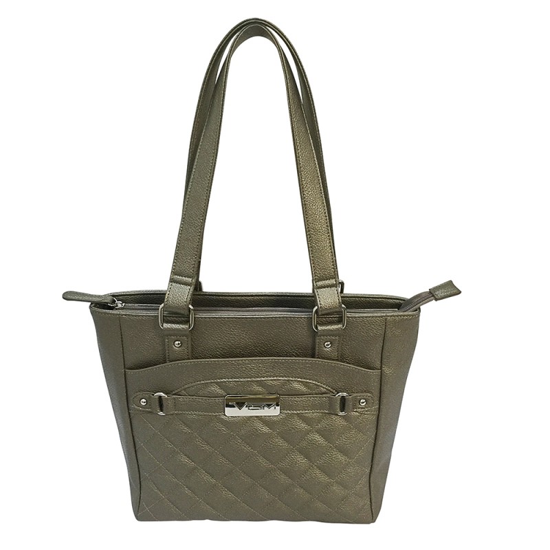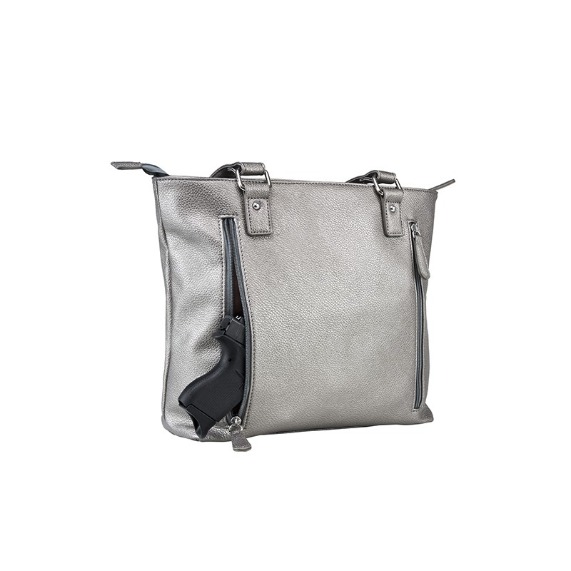 Faux leather Tote purse featuring a large quilted front pocket with magnetic snap-button closure and the primary CCW compartment is located on the back side of the purse with two zippers on either side for easy access to the holster