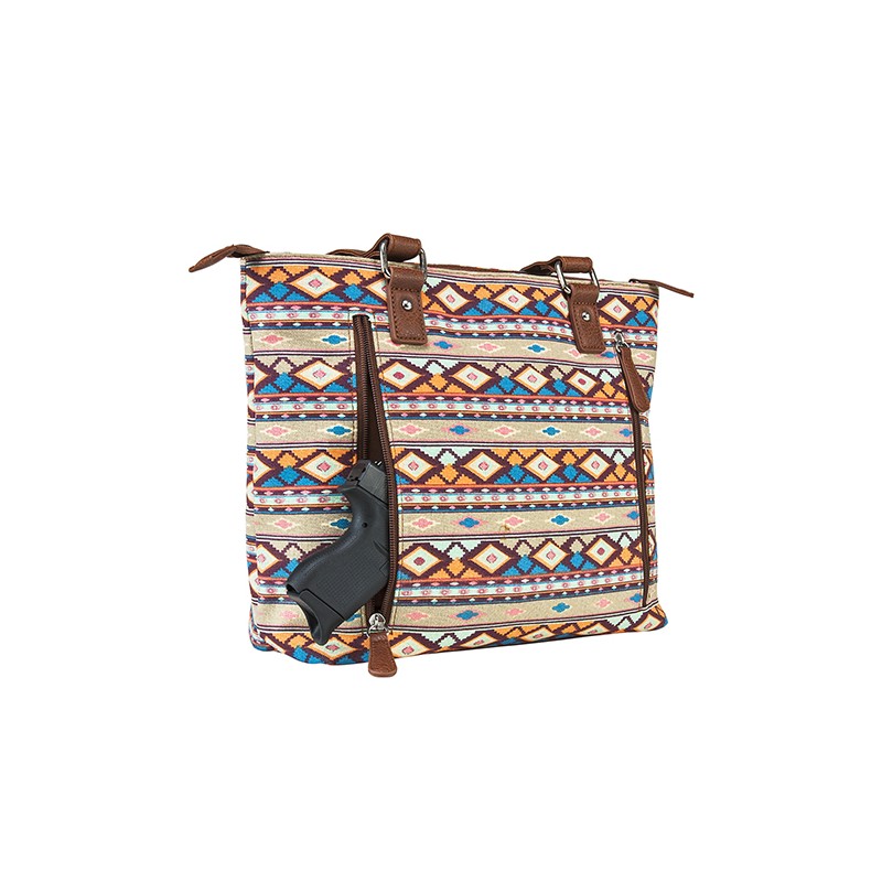 Printed Tote featuring a four front pockets, a large & small zippered pockets, a large pocket with magnetic snap-button closure, another small pocket and the primary CCW compartment is located on the back side of the purse with two zippers on either side for easy access to the holster.