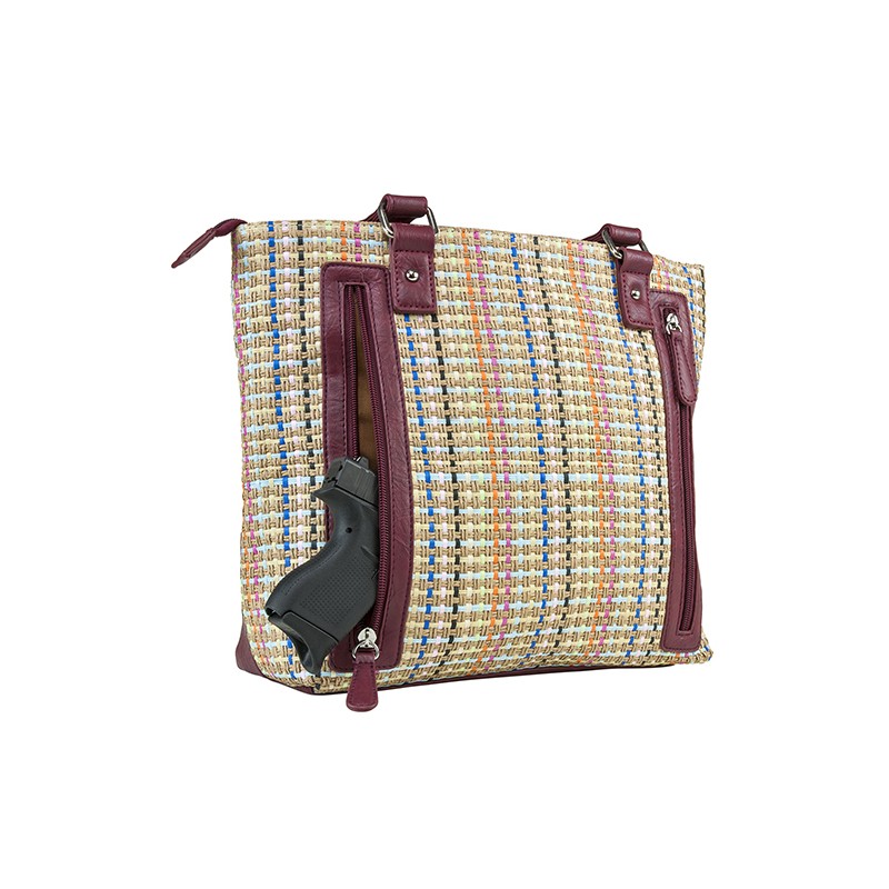 Woven Tote featuring a zippered pocket in the front and the primary CCW compartment is located on the back side of the purse with two zippers on either side for easy access to the holster.