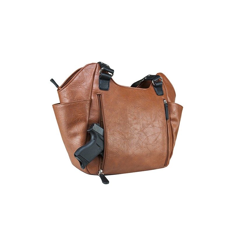 Large Hobo Bag featuring a four front pockets, a large & small zippered pockets, a large pocket with magnetic snap-button closure, another small pocket, side pockets on both ends of the purse, and the primary CCW compartment is located on the back side of the purse with two zippers on either side for easy access to the holster.