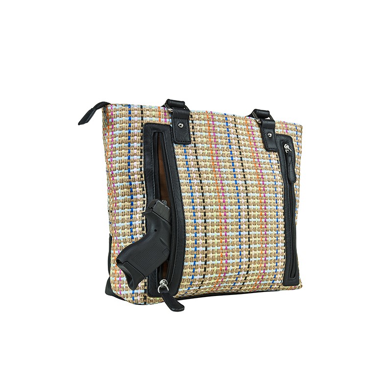 Woven Tote featuring a zippered pocket in the front and the primary CCW compartment is located on the back side of the purse with two zippers on either side for easy access to the holster.