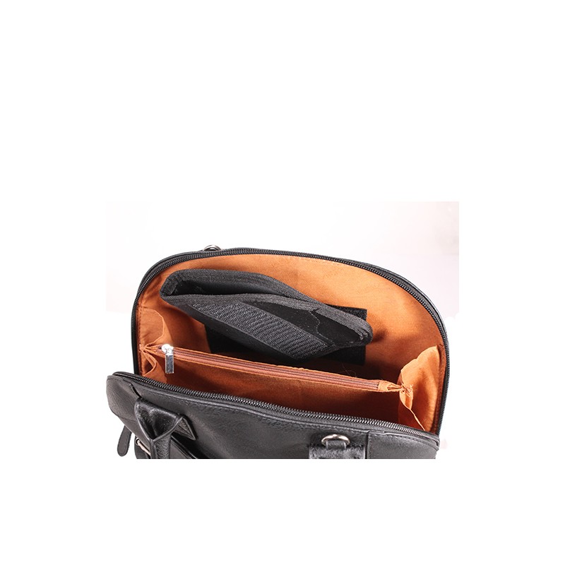 Large center zippered compartment that is split into two separate sections and the center divider features a zippered pocket. One side features a loop fastener patch for a holster with hook fasteners and the other side has a zippered side internal pocket.