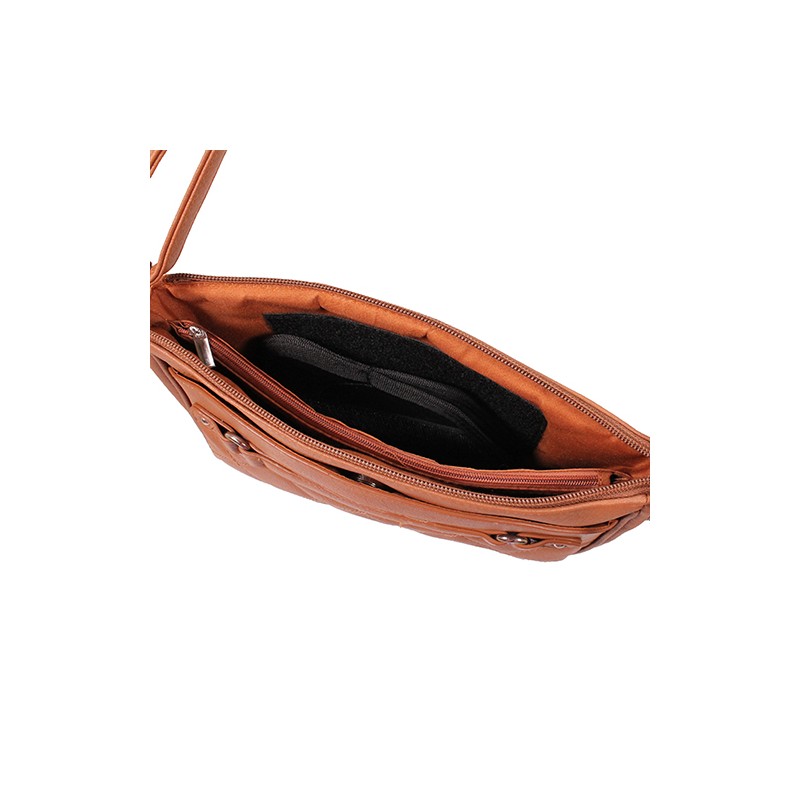 The CCW holster is located in the main zippered compartment of the purse. The bag features an adjustable shoulder strap.