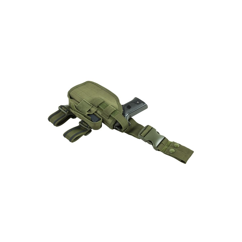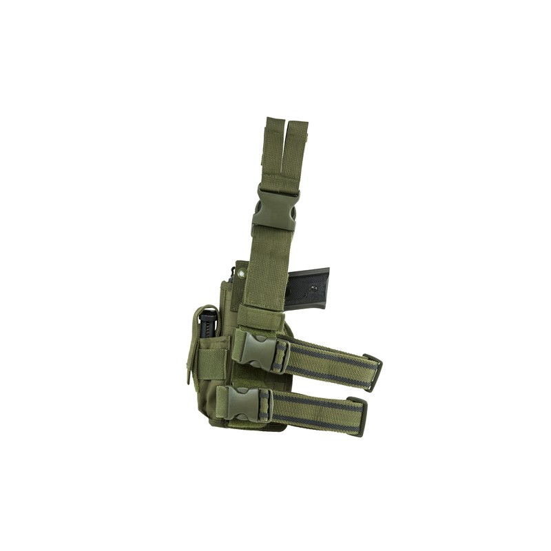 - This Universal Holster features an adjustable Thumb Snap to secure your pistol in the holster, a single Magazine Pouch on the front edge of the holster, two adjustable slip resistant Thigh Straps with Quick Release Buckle, adjustable for height Drop Leg Strap with Quick Connect Buckle, and dual Belt Loops with thumb snaps.