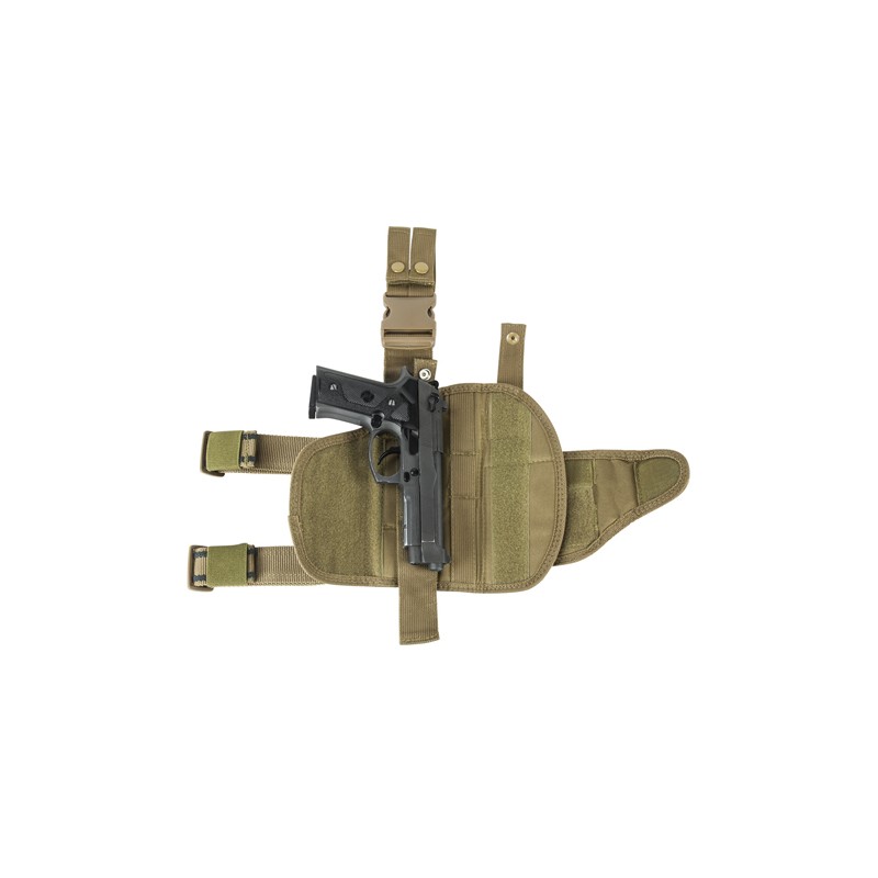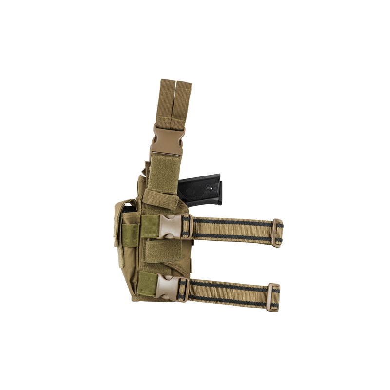 - Holster Belt attachment has two nylon loops with thumb snaps for ease and quick attachment to your belt. The two belt loops (split design) help with securing to belt around pant belt loops. Has a large plastic Quick Connect Buckle for quick attachment and removal of the Drop leg Holster from the shooters thigh