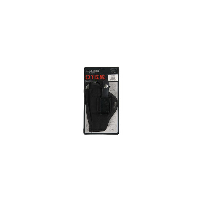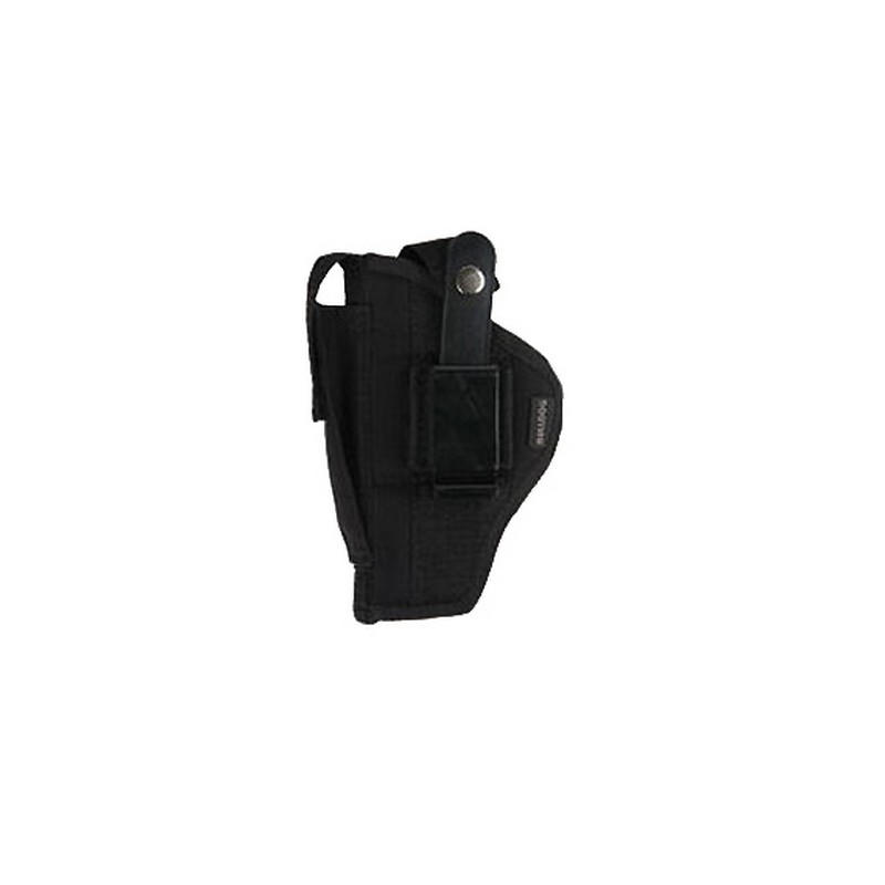 Holster is constructed of sturdy nylon with adjustable thumb break. Ambidextrous design features both a belt loop and pants clip for right or left handed use. Inner wall has a scratch-resistant lining and vinyl vapor barrier to protect the handgun.