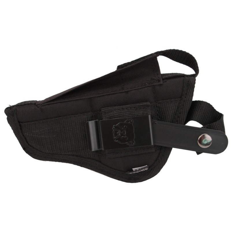 Holster is constructed of sturdy nylon with adjustable thumb break. Ambidextrous design features both a belt loop and pants clip for right or left handed use. Inner wall has a scratch-resistant lining and vinyl vapor barrier to protect the handgun.