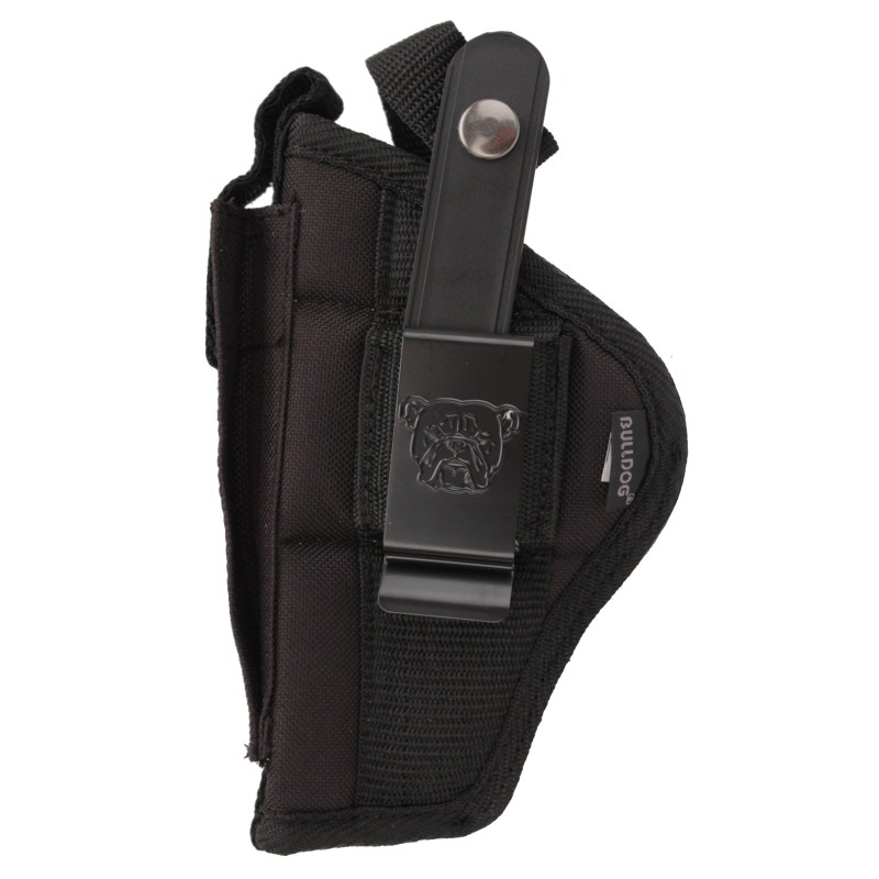 Holster is constructed of sturdy nylon with adjustable thumb break. Ambidextrous design features both a belt loop and pants clip for right or left handed use. Inner wall has a scratch-resistant lining and vinyl vapor barrier to protect the handgun.