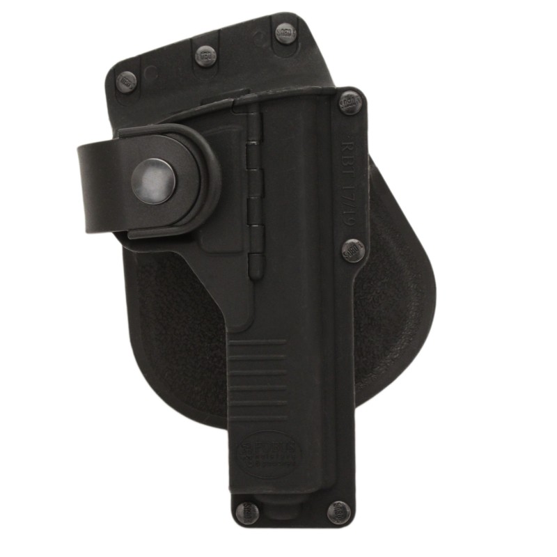 In addition to allowing the carry of handguns that have accessories such as lights or lasers mounted under the barrel or on the trigger guard, Fobus has addressed safety and retention concerns that are unique to this model holster. The handgun is held securely in place by utilization of a muzzle stud and a safety strap that encircles the trigger guard. While assuring positive retention, rapid presentation of the handgun is made easy due to the open withdrawal slot on the rear of the holster and the design of the safety strap.