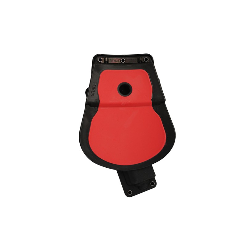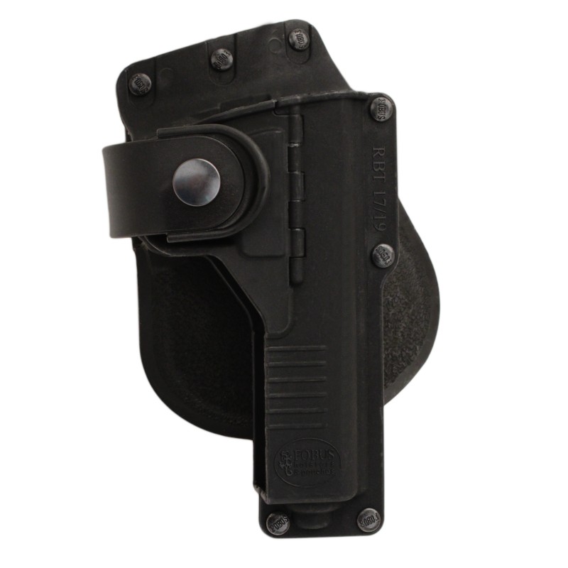 In addition to allowing the carry of handguns that have accessories such as lights or lasers mounted under the barrel or on the trigger guard, Fobus has addressed safety and retention concerns that are unique to this model holster. The handgun is held securely in place by utilization of a muzzle stud and a safety strap that encircles the trigger guard. While assuring positive retention, rapid presentation of the handgun is made easy due to the open withdrawal slot on the rear of the holster and the design of the safety strap.